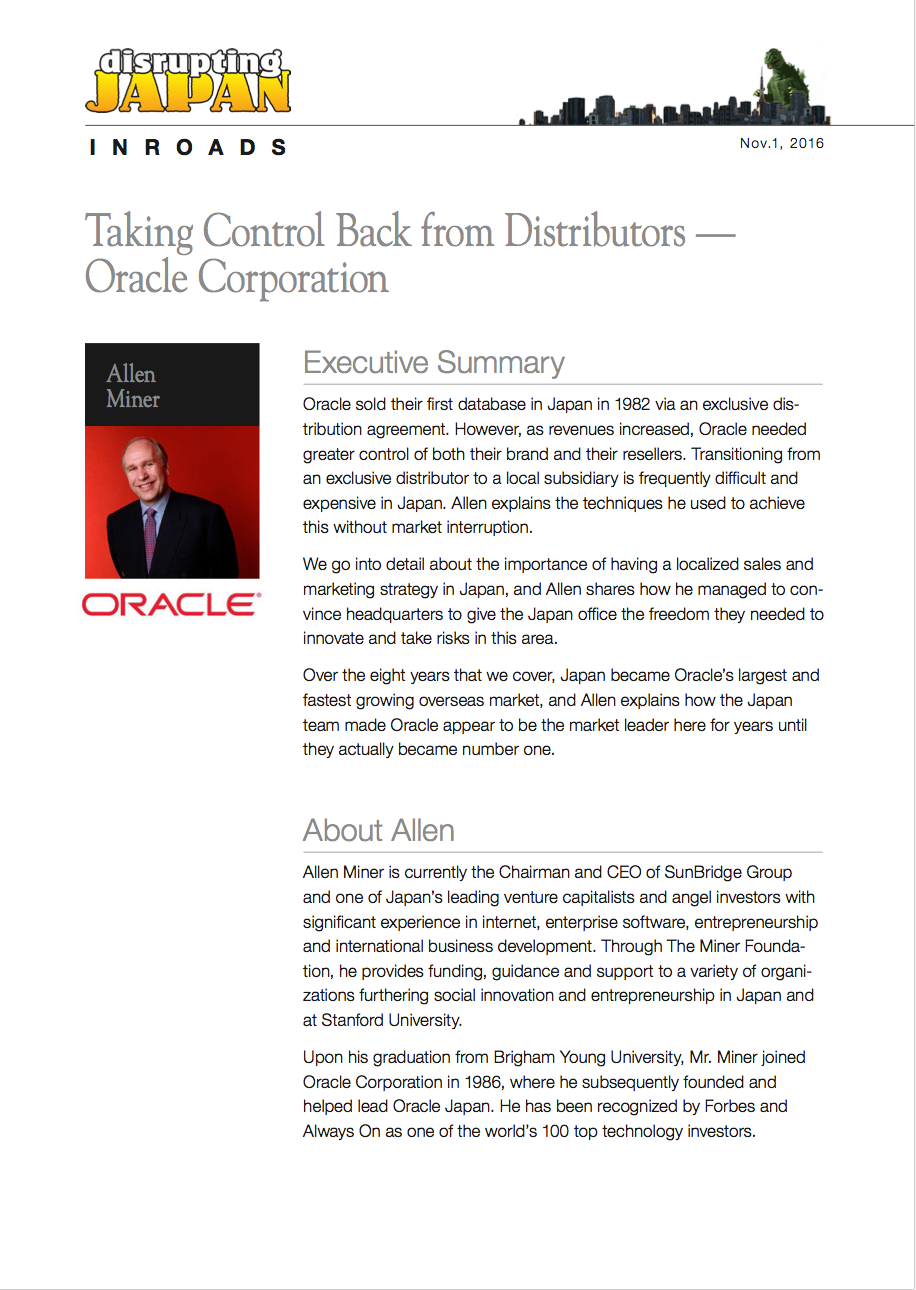 Allen Miner explains how Oracle amicably (and inexpensively) negotiated out of their exclusive Japanese distribution agreement. He also details the unique marketing strategy Japan used to convince the public that they were the market leaders long before they achieved that distinction.